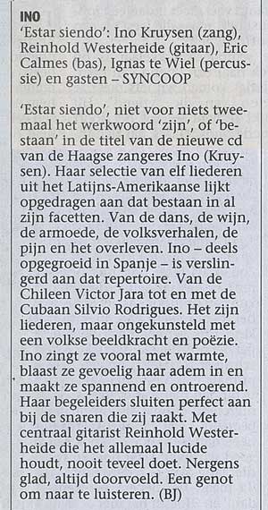 door B.J. 'Estar siendo': Ino Kruysen (zang), Reinhold Westerheide (gitaar), Eric Calmes (bas), Ignas te Wiel (percussie) en gasten - SYNCOOP 'Estar Siendo', niet voor niets tweemaal het werkwoord 'zijn', of 'bestaan' in de titel van de nieuwe cd van de Haagse zangeres Ino (Kruysen). Haar selectie van elf liederen uit het Latijns-Amerikaanse lijkt opgedragen aan dat bestaan in al zijn facetten. Van de dans, de wijn, de armoede, de volksverhalen, de pijn en het overleven. Ino - deels opgegroeid in Spanje - is verslingerd aan dat repertoire. Van de Chileen Victor Jara tot en met de Cubaan Silvio Rodrigues. Het zijn liederen, maar ongekunsteld met een volkse beeldkracht en poëzie. Ino zingt ze vooral met warmte, blaast ze gevoelig haar adem in en maakt ze spannend en ontroerend. Haar begeleiders sluiten perfect aan bij de snaren die zij raakt. Met centraal gitarist Reinhold Westerheide die het allemaal lucide houdt, nooit teveel doet. Nergens glad, altijd doorvoeld. Een genot om naar te luisteren. B.J. |