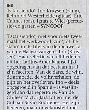 'Estar Siendo', niet voor niets tweemaal het werkwoord 'zijn', of 'bestaan' in de titel van de nieuwe cd van de Haagse zangeres Ino (Kruysen). Haar selectie van elf liederen uit het Latijns-Amerikaanse