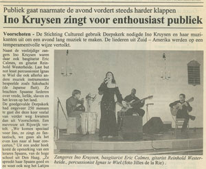 Ino Kruysen es el nombre de la cantante, que tiene una voz espectacular y que estuvo acompañada de Reinhold Westerheide (guitarra) e Ignal te Wiel (percussion y sakuhachi). Lo más
