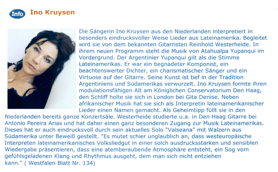 Die sängerin Ino Kruysen aus den Niederlanden interpretiert in besonders eindrucksvoller Weise Lieder aus Lateinamerika. Begleitet wird sie vondem bekanten Gitarristen Reinhold Westerheide. In ihrem neuen Program steht die Musik von Atahualpa Yupanqui im Vordergrund. Der Argentinier Yupanqui gilt als die Stimme Lateinamerikas. Er war ein begnadeter Komponist, ein beachtenswerter Dichter, ein charismatischer Sänger und ein Virtuose auf der Gitarre. Sein Kunst ist tief in der Tradition Argentiniens und Südamerikas verwurzelt.